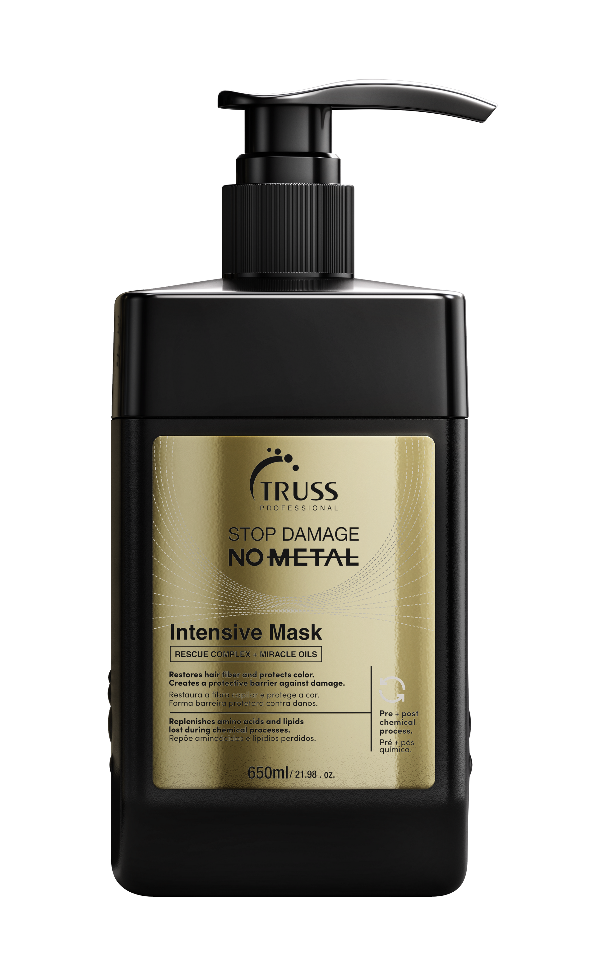 The TRUSS Intensive Mask Stop Damage No Metal Conditioner (650ml) is a professional-grade treatment designed to repair and rejuvenate damaged hair. Its advanced formula restores protein mass, enhancing strength and promoting healthier hair growth. This intensive mask seals the cuticles, improving elasticity and shine while reducing frizz. Ideal for chemically treated or mechanically stressed hair, it provides deep hydration and anti-aging benefits, leaving hair revitalized and resilient.